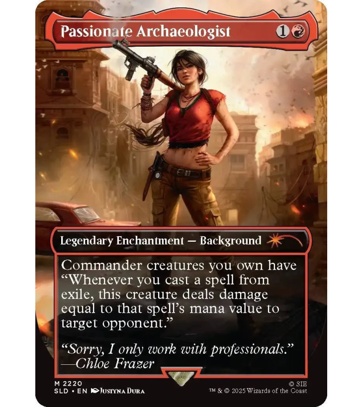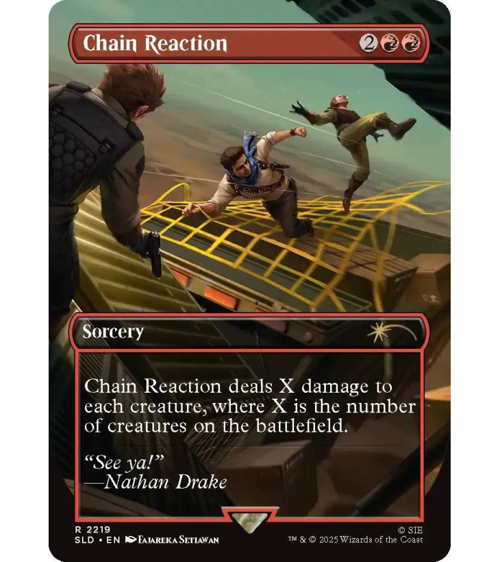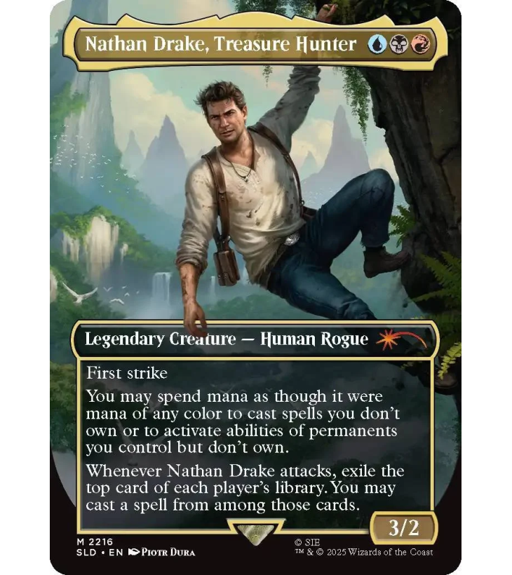 Ce drop Secret Lair x Uncharted (version anglaise, non-foil) invite le plus téméraire des chasseurs de trésors à faire une entrée fracassante dans Magic: The Gathering, avec une carte inédite qui met en avant son charme de brigand. Et pour ne rien gâcher, il sera enfin entouré des nombreux artefacts et trésors qu’il désire.